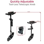 The Camera Base plate of DSLR Stabilizer has 1/4″ mounting slots (holes) to allow most camera bases. You can slide your camera on both the horizontal and vertical axis using the thumbscrews to adjust your horizontal balance. Moves back to front, and side to side, quickly allow you to adjust horizontal balance of camera.Wheelbarrow bearing provides rotational camera control with easy ‘on axis’ movement. The handgrip swivels left and right from the bolt. You can easily move whole hand held stabilizer up and down. Angle bracket enables grip to move up and down.